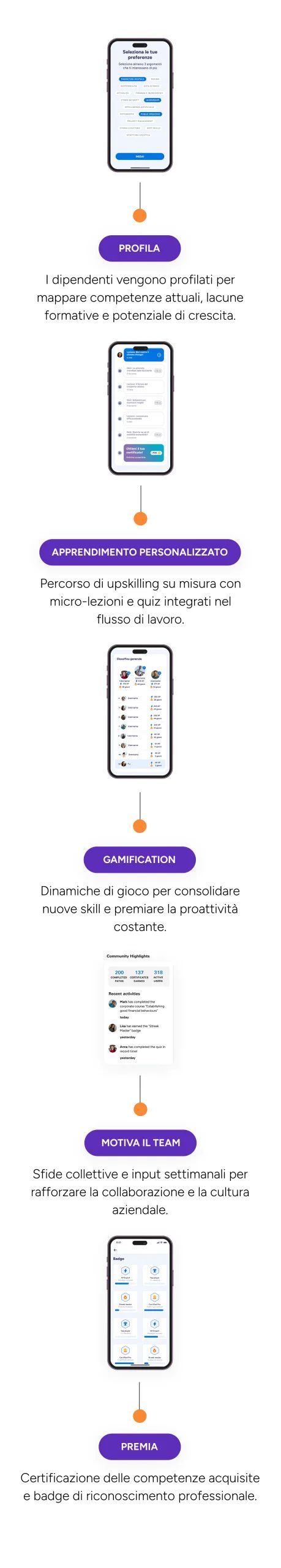 Grazie a dinamiche di gamification e roadmap personalizzate, rendiamo l'apprendimento un'abitudine quotidiana misurabile e ad alto tasso di completamento.